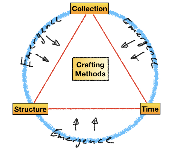 In the months since my last post on the methodology project Common Ground, the model has taken quite a different form: Initially I presented the four phases (collection, structure, timing and emergence) as a table, simply mentioning them and giving a short explanation what each phase entails. This representation has developed towards a form that acknowledges the interconnection between the different layers, specifically the layers of collection, structure and time (notice that “timing” has been changed to “time”, on which I will elaborate in a later post). It places emergences much more central, by giving it a place from which it can “do its work” on different elements of a research design, and presented emergence more as an underlying or overall counter-acting force, rather that a separate layer in a four-layer-system: