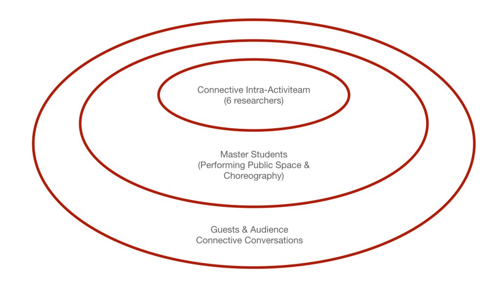 The professorship works with the core principles of collectivity, collaboration, trust and emergence. In order to explore and develop the notion of Artistic Connective Practices, one central methodological approach is collectively thinking together. This happens in different “circles”, teams or groups, which also contribute to the growing network of the research community at FHK, typically through conversations, writing, reading and discussing resonances with artistic works and practitioners. The first circle I gathered around me is the Connective Intra-Activiteam (which’s name is inspired by Karen Barad’s notion of intra-action). By extending these circles, one step at a time, the overall research network has grown throughout the year: from the core team of the professorship surrounding the conceptual development of ACP, to student groups within the master programmes, to the guests and audiences in the Connective Conversations.