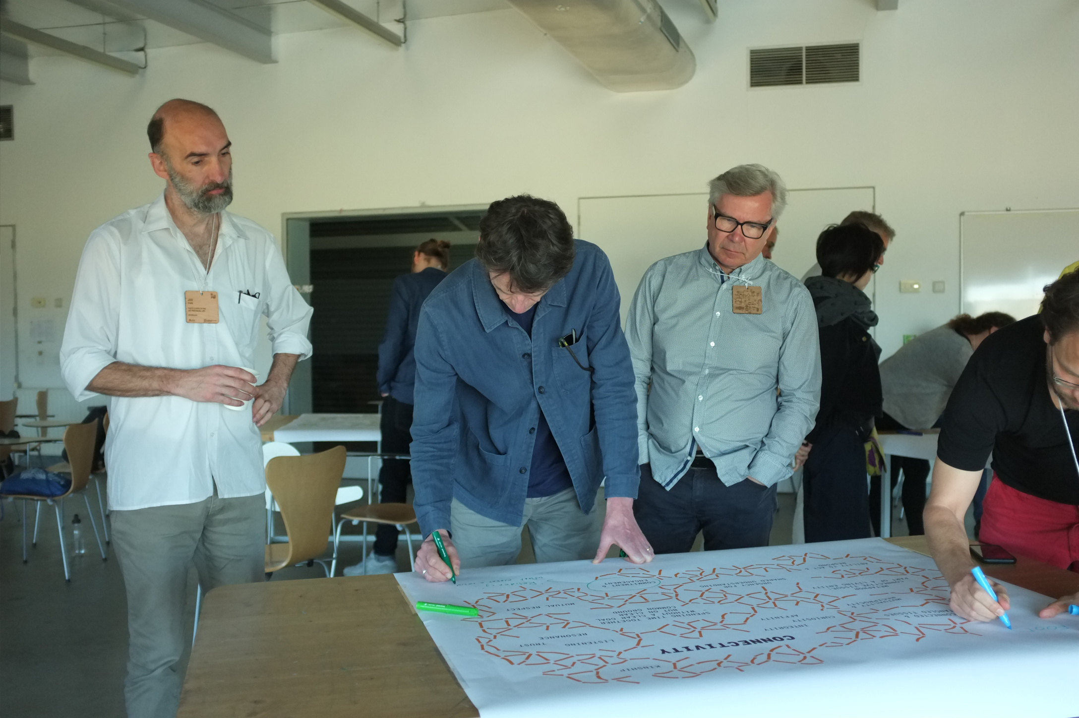 Directly after the running session, I headed towards my own presentation and workshop, which was part of the “Careers in the Arts” session. My idea was to introduce the participants to the concept of our professorship, artistic connectivity, and explore it through the notion of situatedness, with our projects of socially engaged artistic research residencies (such as local communities or care homes) as practice cases. We used large printed versions of our conceptual clouds (artistic, connectivity, and practice, in the wonderful design by Siel Damen) to explore, annotate, and discuss (more on the creation process of the clouds’ visualisation will come in a future post). The presentation sparked an interesting discussion on how such residencies might find their way into higher arts education and thus the work of students.