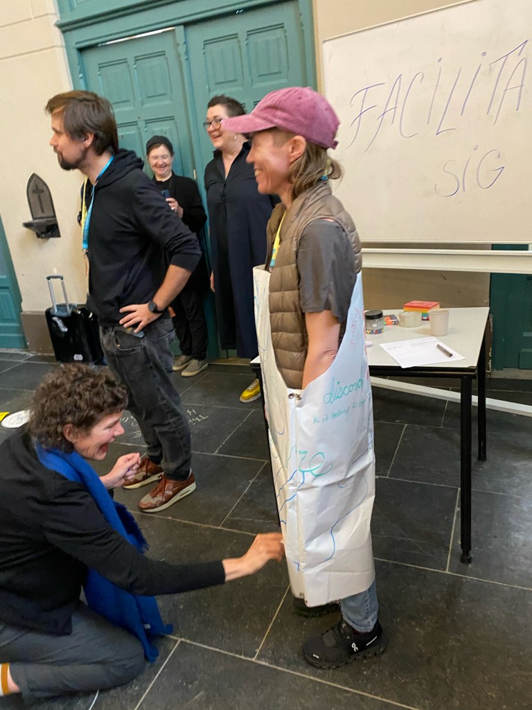 The visit to the Facilitating SiG was where we spent most of our time. On the images: A session in which members of the group experimented with materials to rethink the format of the whiteboard — in 3D.