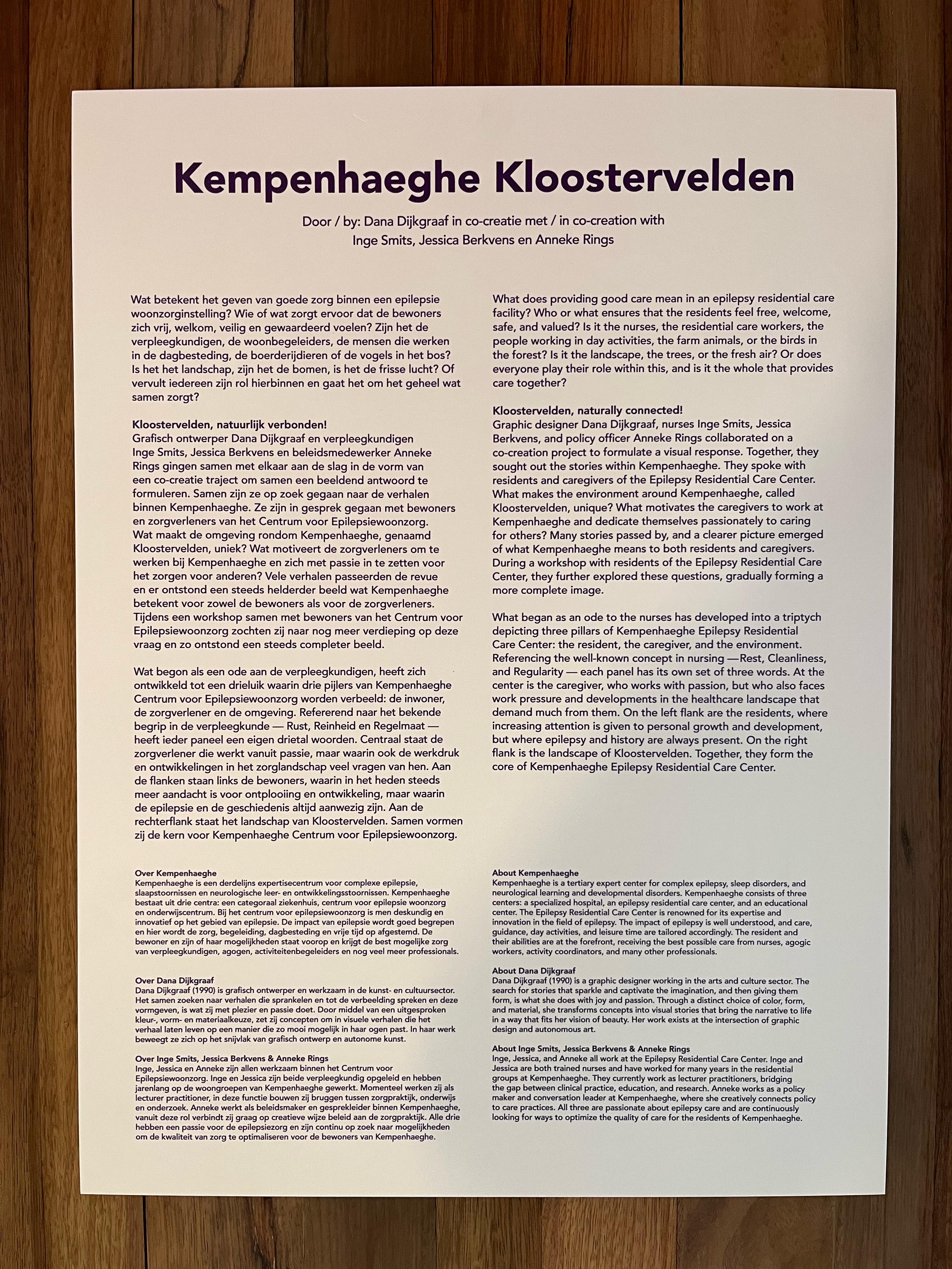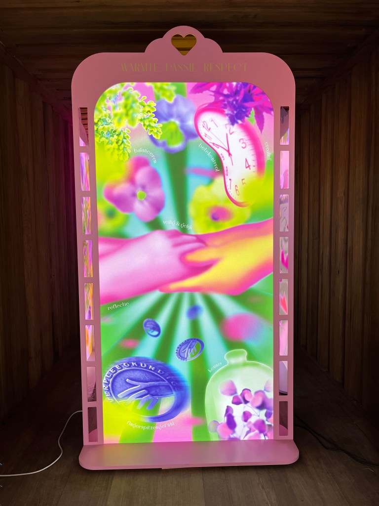 The three works are placed in and around an exact wooden replica of a sea container. The container represents the often invisible and continuous flow of care work that deserve more attention. No iron cargo containers, staged up high at the port of Rotterdam but an unique, wooden, custom made one. Visitors are encouraged to think about what nurses do, the impact of their often invisible work, and how this work contributes to the sustainability of healthcare system, now, and in the future.